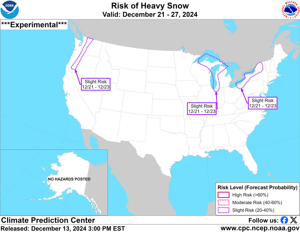 So far, December 2024 has been much cooler and snowier than last year, but what does that mean for the rest of the month? Thanks to the weak La Niña, the temperature swings we’ve seen are likely to continue. Things look like they will be trending cooler again by late next week, which could mean more snow. The most recent 8-14 day hazards outlook showed a slight risk for heavy snow December 21-23, including areas downwind of Lake Michigan. You can see this outlook below, and many others, on the Medium Range Outlooks page.