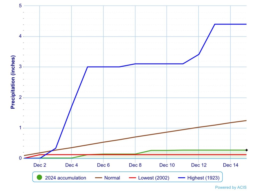 As the graph above shows, we are below normal in terms of precipitation so far. I’ve measured about 0.40” of rain in the last 12 hours, which will help, but we’re still only about halfway to our normal for this point in December—and that’s with the snow earlier in the month.