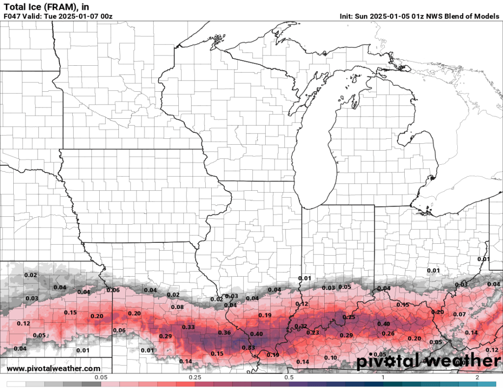 South of Bloomington, snow totals will be lower, but only because freezing rain will lead to ice accumulation that will become more severe as you approach and cross the IN/KY state line.