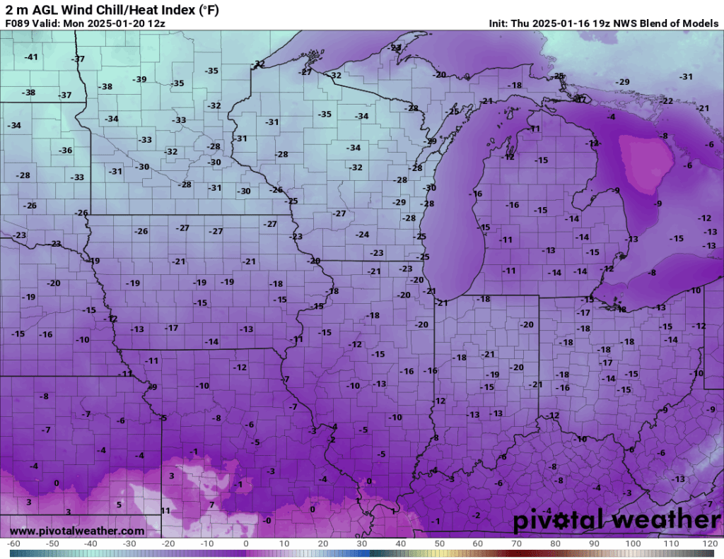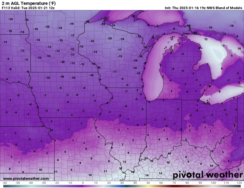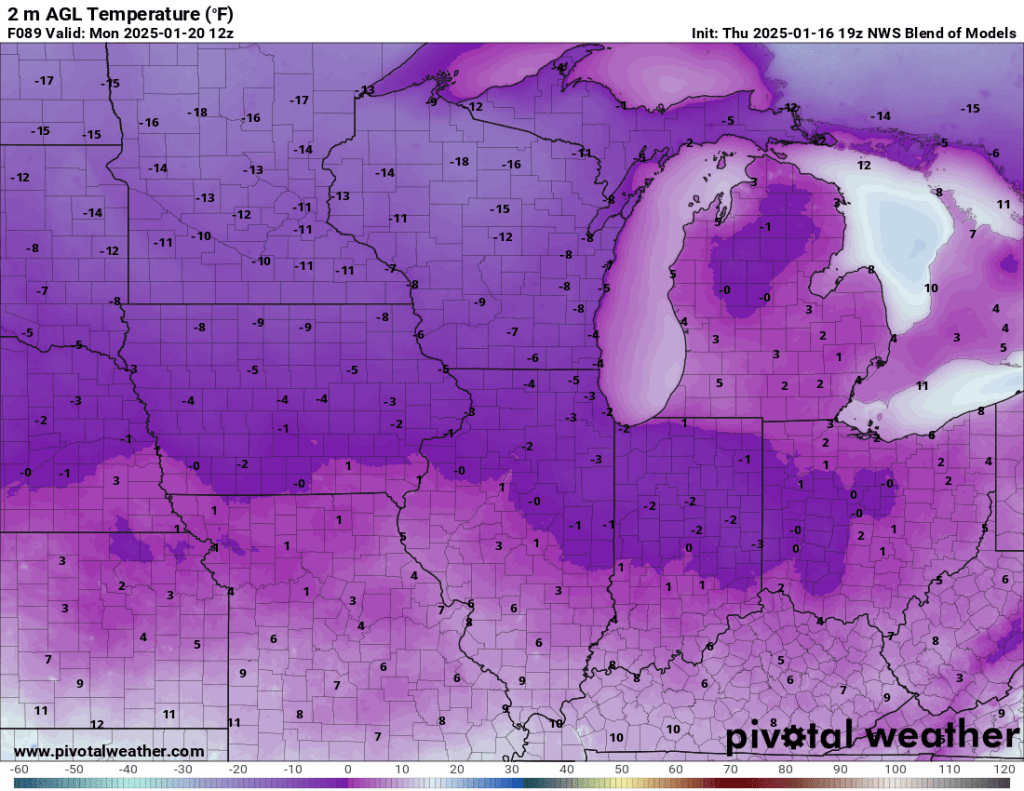 There is little moderation in temperature expected on Monday, with a high temperature likely to peak at or below 5°F. Windchills will remain at or below -20°F straight through Wednesday morning. Lows Monday night into Tuesday morning are expected to fall to between -5°F and -10°F. Tuesday’s “high” is also expected to be 5°F or lower. Tuesday night into Wednesday morning, we drop to around -5°F again.