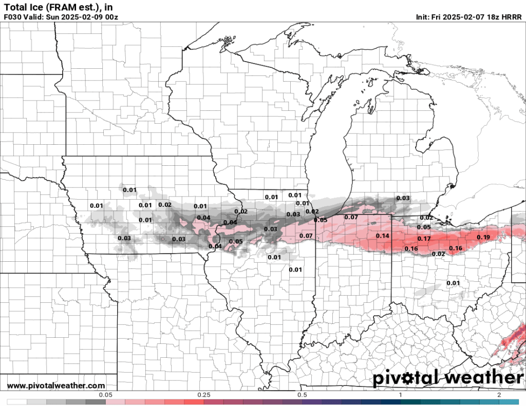 Chances are good that we will see more ice tomorrow afternoon. The best guess right now is between 0.05” and 0.10” of ice accumulation, which is possible between noon and 6 PM tomorrow. I’d lean on the lower end of that estimate, but as we saw earlier this week, even a few hundredths of ice can cause travel woes. With our last ice event, the HRRR model handled it well. Here’s a look at the latest run of that model: