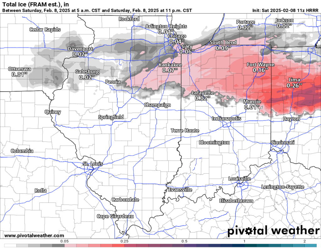 The latest runs from most models, including nearly all CAMs (except the HRRR that did well with the ice earlier this week), have shifted the ice south of Goshen. Areas like Syracuse and Warsaw would be on the northern edge of the ice, and Goshen, Dunlap, and Elkhart would see more mixed precipitation, leaning heavier on sleet and snow. Though, even if we do see mainly snow and sleet, it wouldn’t amount to more than an inch or two. This is a more recent trend, so the overnight model runs will be key in identifying whether these runs are outliers or a trend that will stick. No matter what, tomorrow afternoon isn’t going to be the best time to be out on the roads if you can help it.