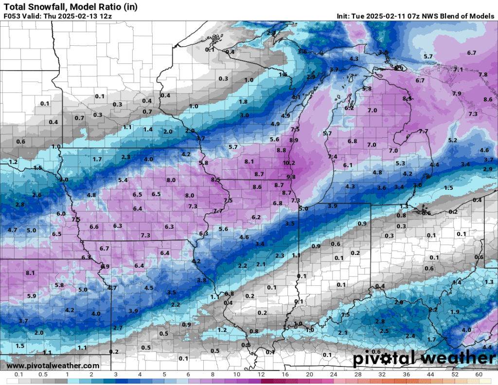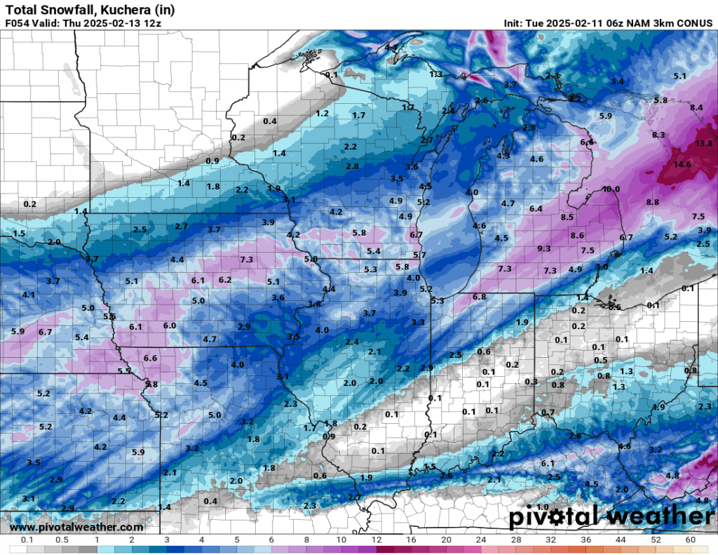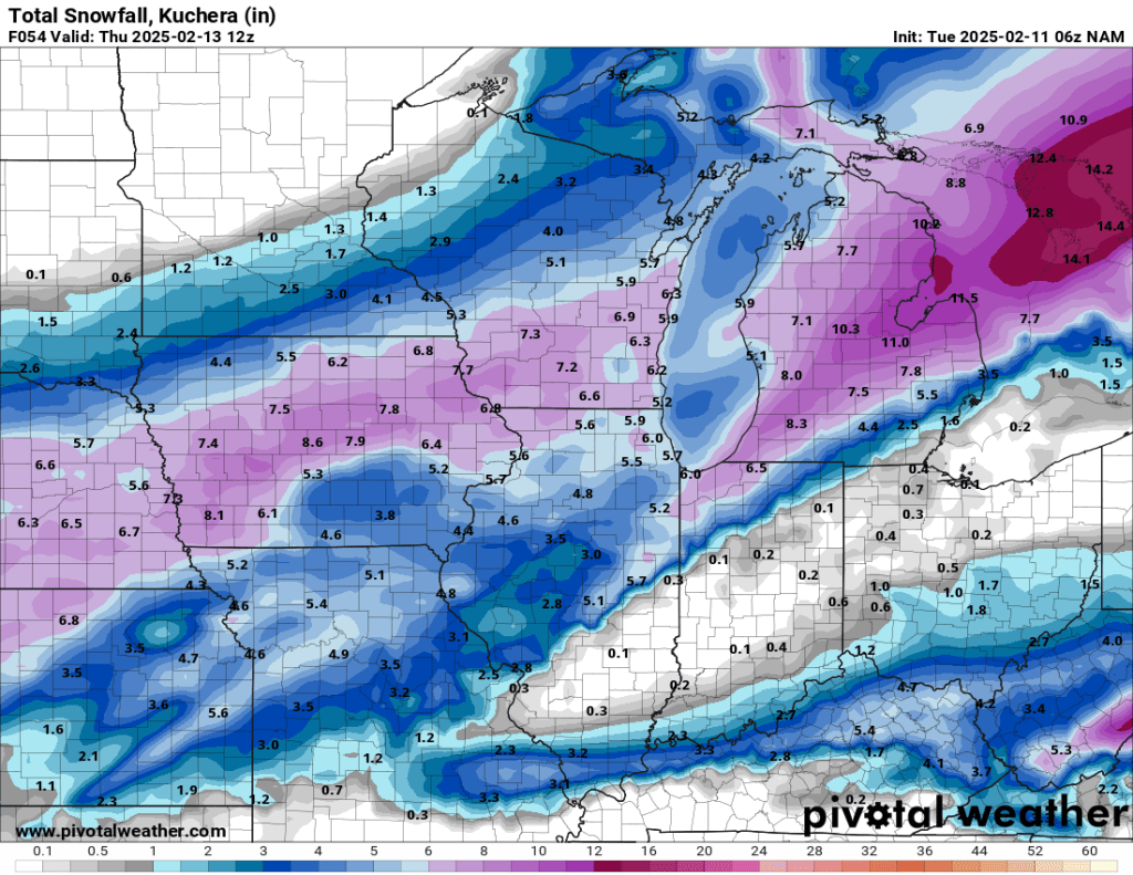 For the last three days, the global models have been bullish on moderate to heavy snow sometime between Wednesday and Friday in our vicinity. The big dogs (Euro and GFS) are still seeing moderate to heavy snow, but the Euro has shifted the heaviest snow just northward into Chicagoland. The model runs overnight and shifts things back to the east. If this continues today, it would add confidence to more snow locally. This shift is evident in every model, which is rare and lends itself to higher confidence.