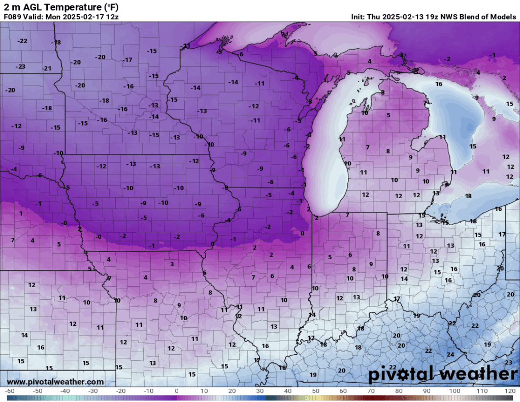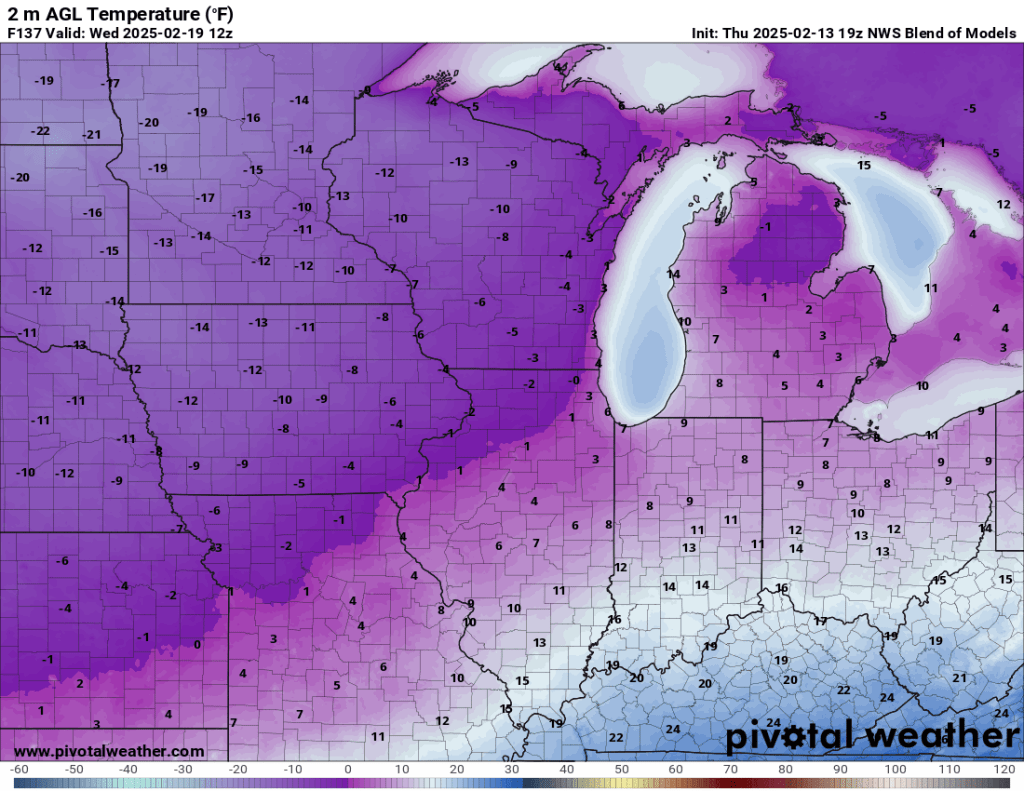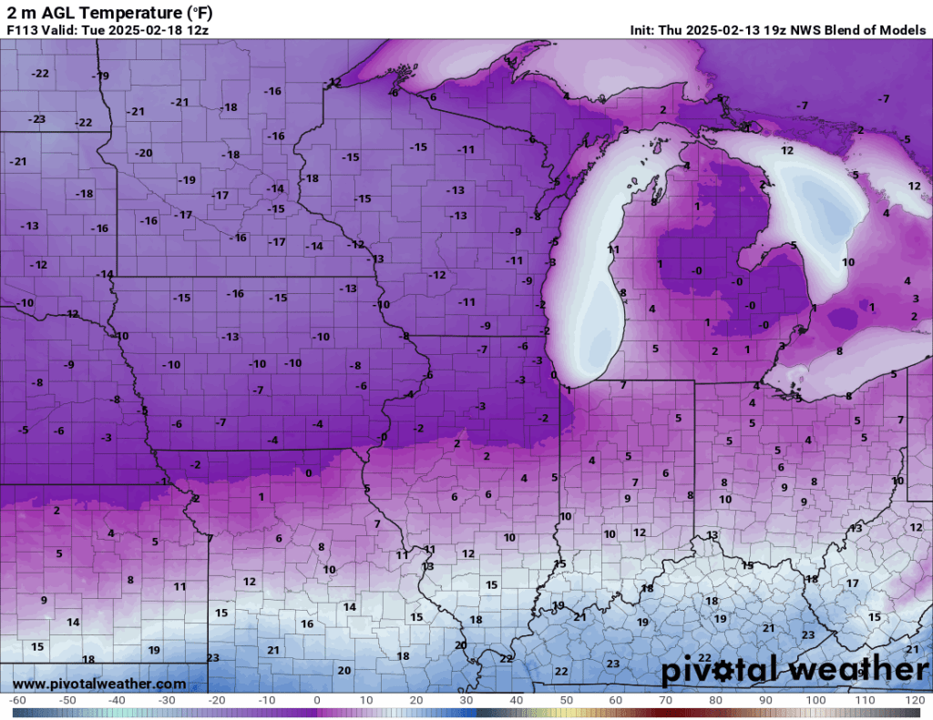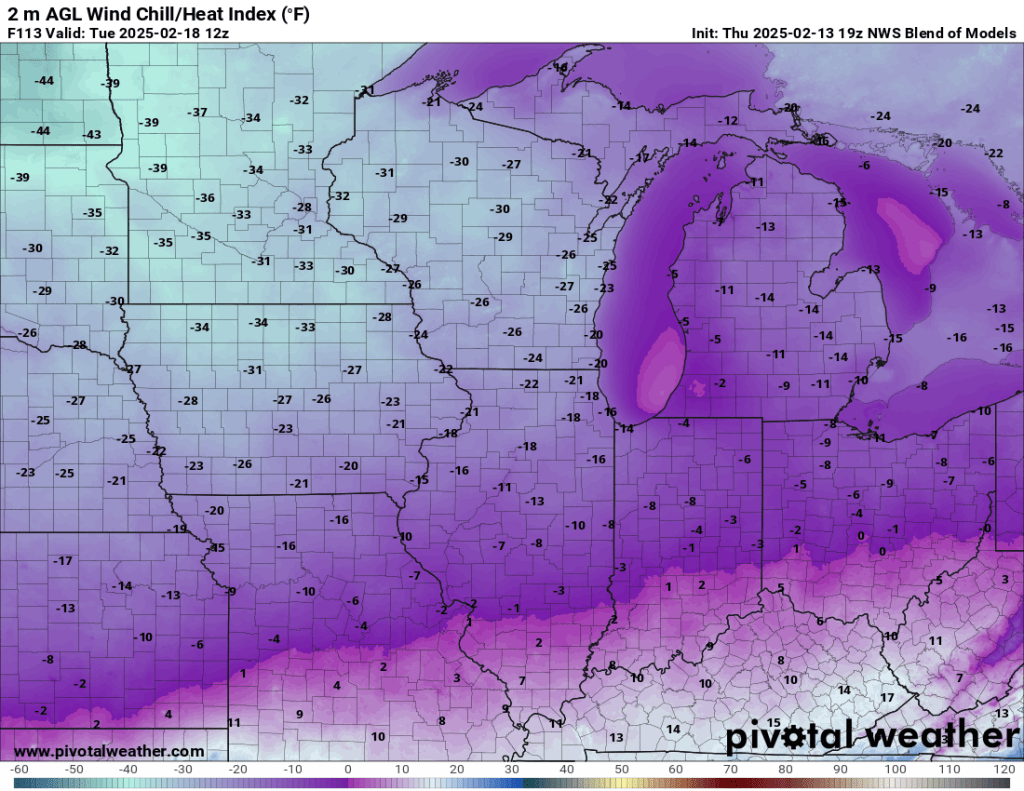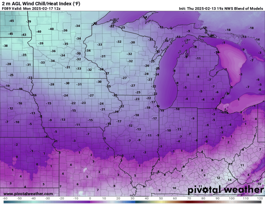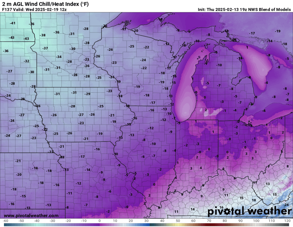 Everything winds down by Monday, and we’ll be just plain cold for the first half of next week. Temperatures are forecast to fall into the single digits overnight and only rise into the teens in the afternoon. Wind chills will range from 0°F to perhaps -15°F at times. If we see more snow, these temperatures will have to be adjusted slightly lower.