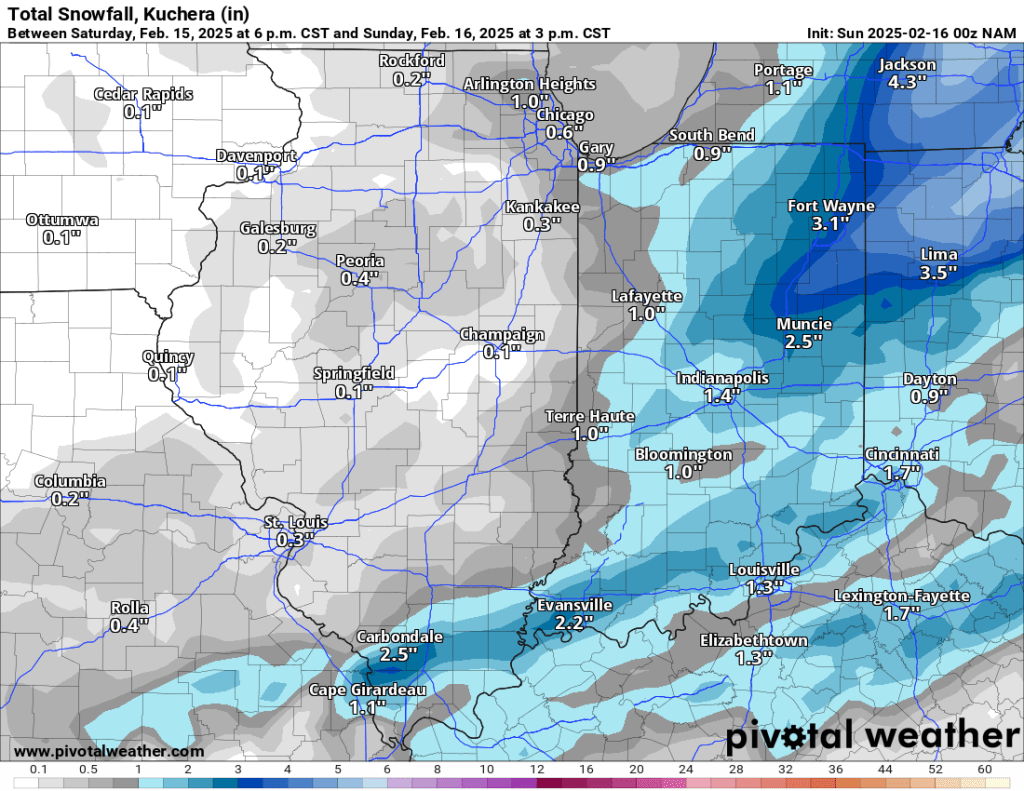 Last night, I mentioned that the CAMs (convection-allowing models—short-range models that factor in more current conditions than the global models can) were forecasting moderate to heavy snow on Sunday. The NAM (North American Model) was one of those models that picked up on heavy snow locally. However, since my last update, a steady trend has been pushing the snow further and further east. You can see for yourself below.