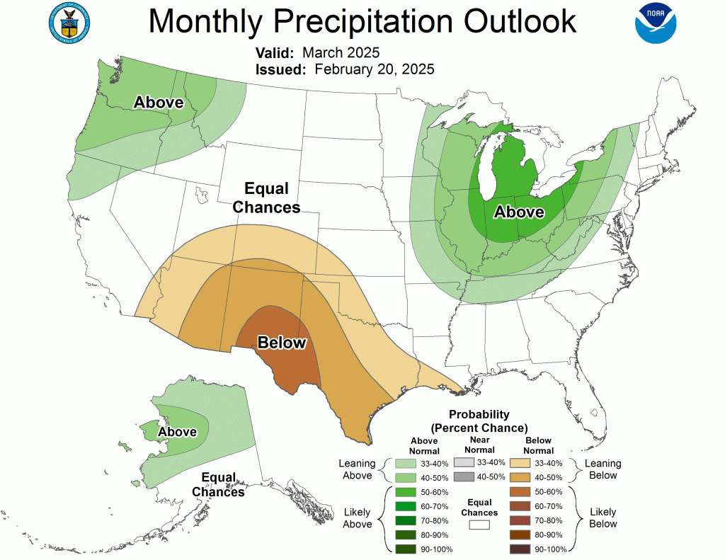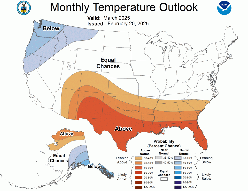 This pattern also lends itself to intrusions of cold air, and while we will still see warm days, the overall pattern would be for a cooler-than-average spring. With the extended periods of active weather, we will likely see a wetter-than-usual spring as well. The CPC outlook for March was released a few days ago and mirrors these expectations.