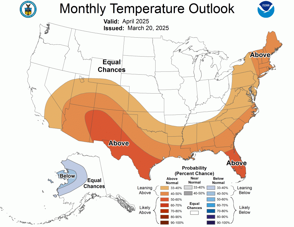This last outlook extends into mid-April and clearly indicates warmer-than-normal temperatures. What concerns me a little is that the most recent outlook for all of April paints a different picture.