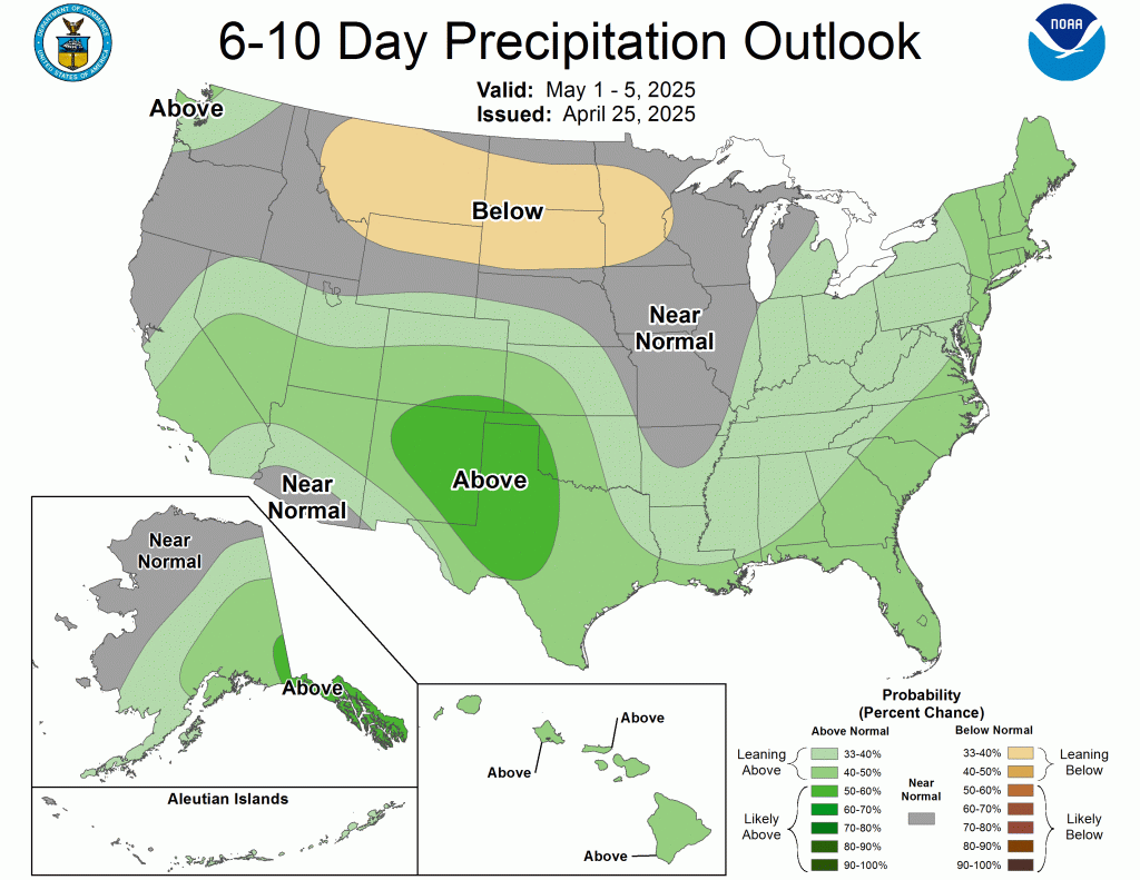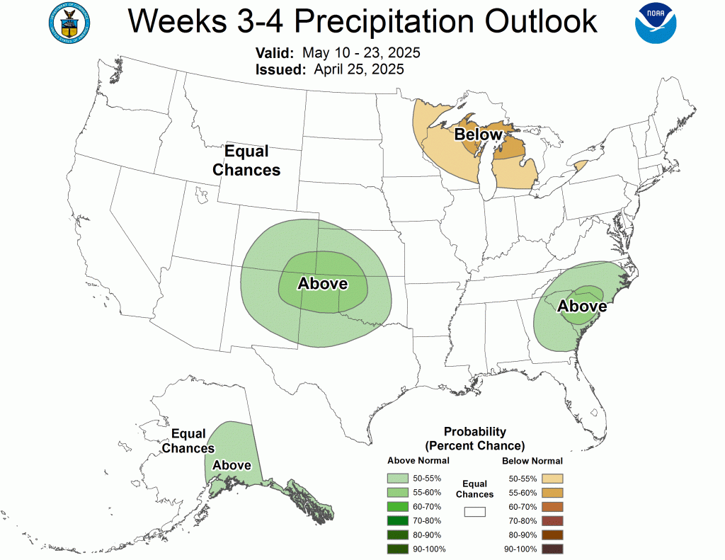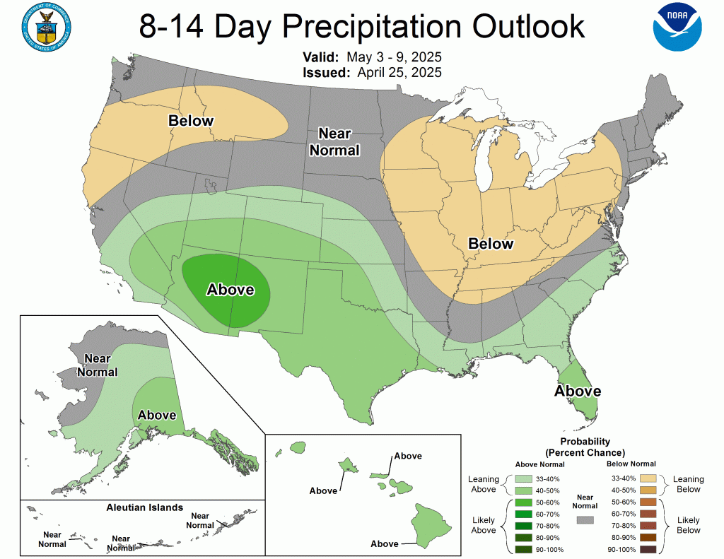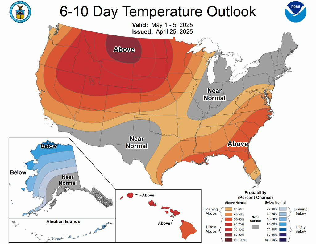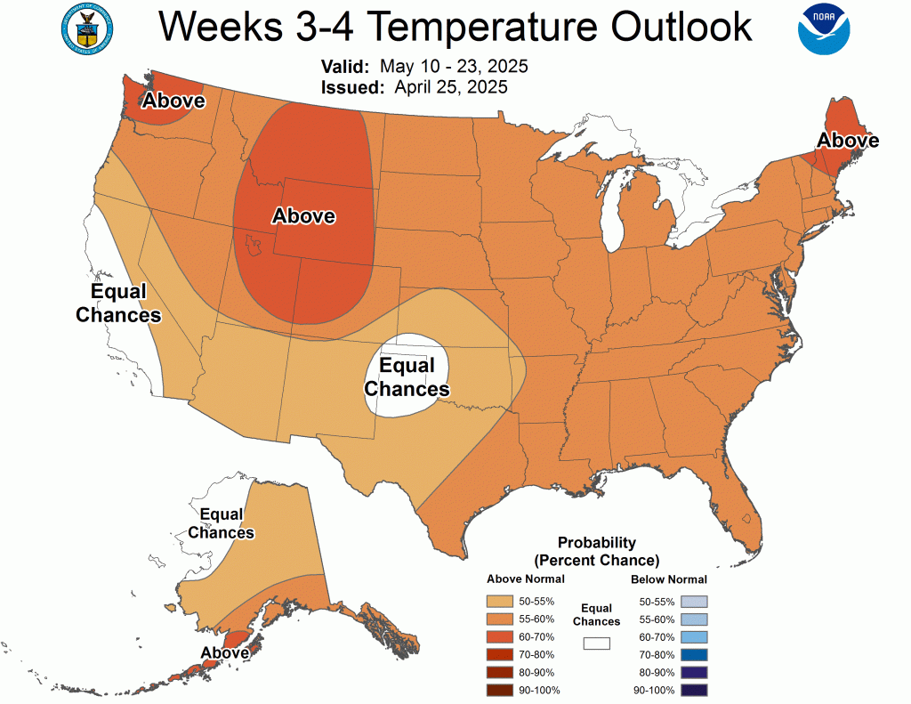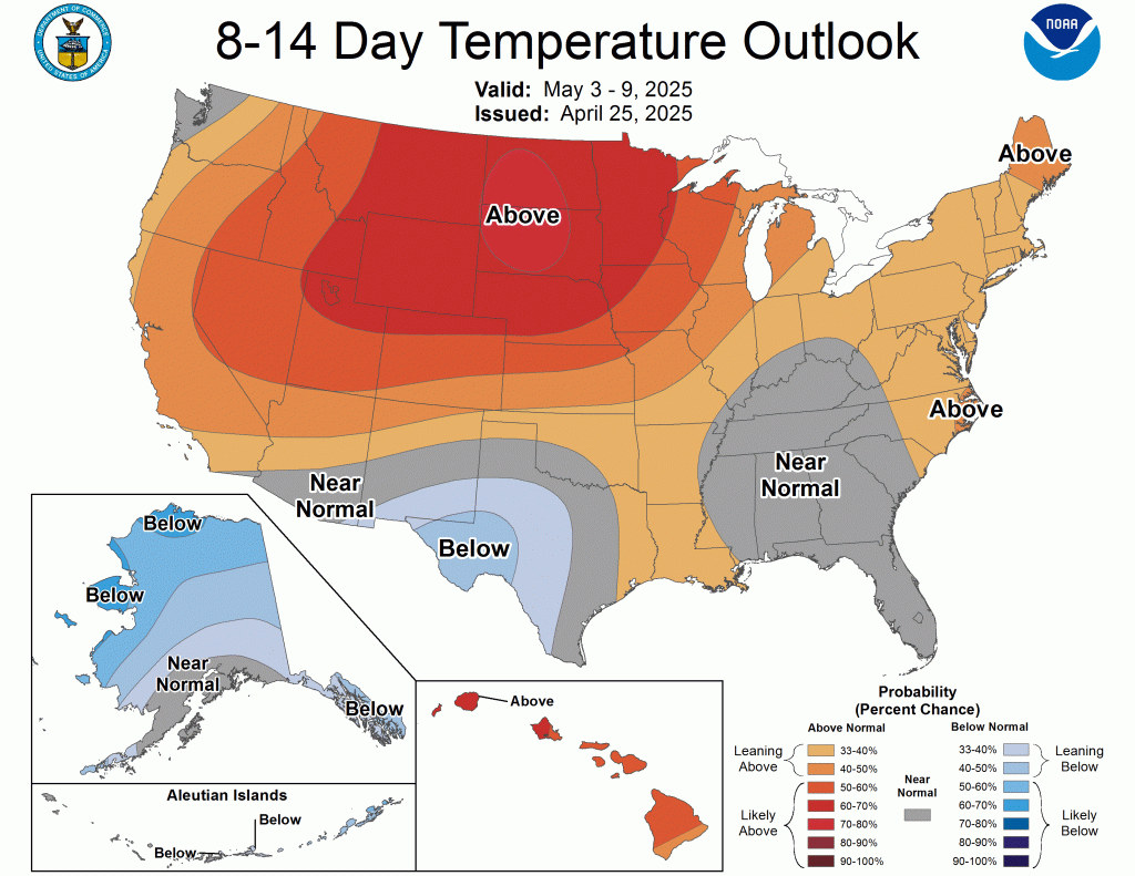 While we will see some cool mornings, especially the next few that will flirt with the mid-30s, the theme overall remains warmer than average. The latest CPC outlooks show the warmth lasting well into May.