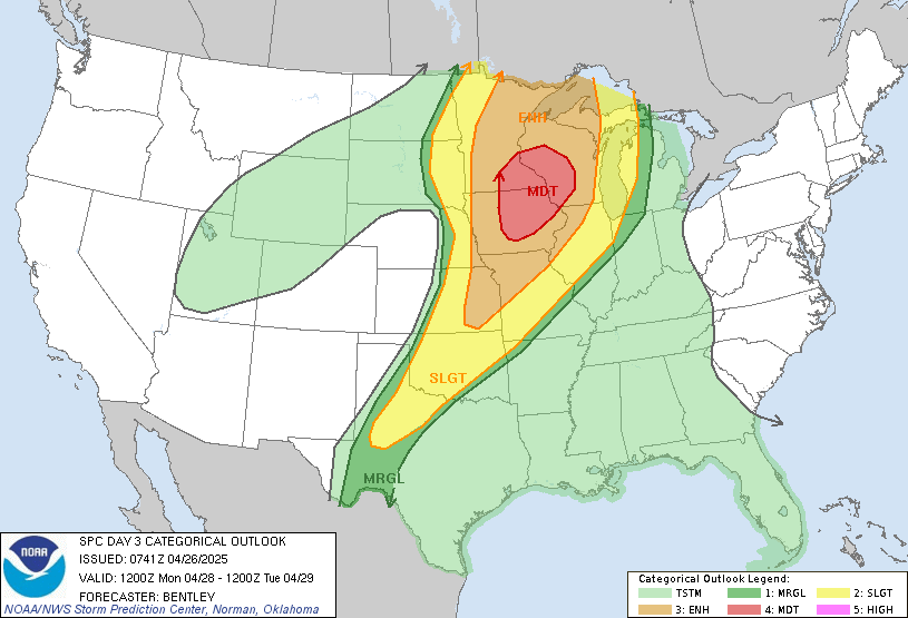 Now, let’s examine the severe weather potential for early next week. The SPC is already highlighting areas of the upper Midwest for Monday. This is very similar to what we saw with our first two rounds of severe weather in March—a fairly specific area of higher risk several days in advance.
