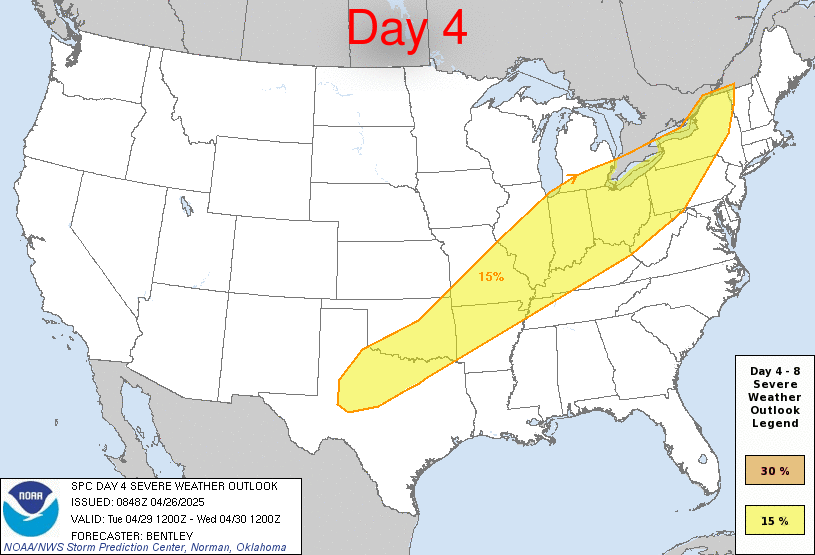 This energy will undoubtedly move east and pass through Goshen. However, questions remain about timing and atmospheric conditions. My best guess now is that the severe weather from Monday will slide through our area early on Tuesday in a much weaker state. This could muddle the atmosphere and limit the development of more severe weather later in the day when the cold front passes through. It’s one of those deals where the more sun we see, the greater the chances will be (how’s that for a rhyme?). The SPC has kept us in the Day 4 area of 15% risk, but that area has shifted further east, supporting my hypothesis on Tuesday’s system’s evolution.