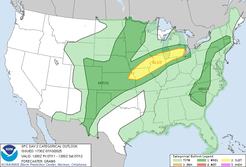 However, this activity will likely wane as it approaches. This energy will pick up again on Saturday, and while we are on the edge of another area of slight risk, I suspect storms will develop here or even slightly east and gain strength as they move away. The latest SPC outlook supports this hypothesis.