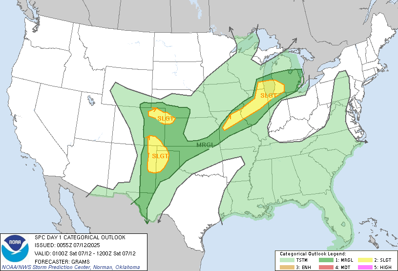 7/11 PM Update: The SPC has trimmed Goshen from the slight risk area tonight. There is a Tornado Watch to our west, but I expect this to expire and not be expanded east to include us. We will be lucky to see much of any shower/storm activity through tomorrow morning, let alone severe weather.