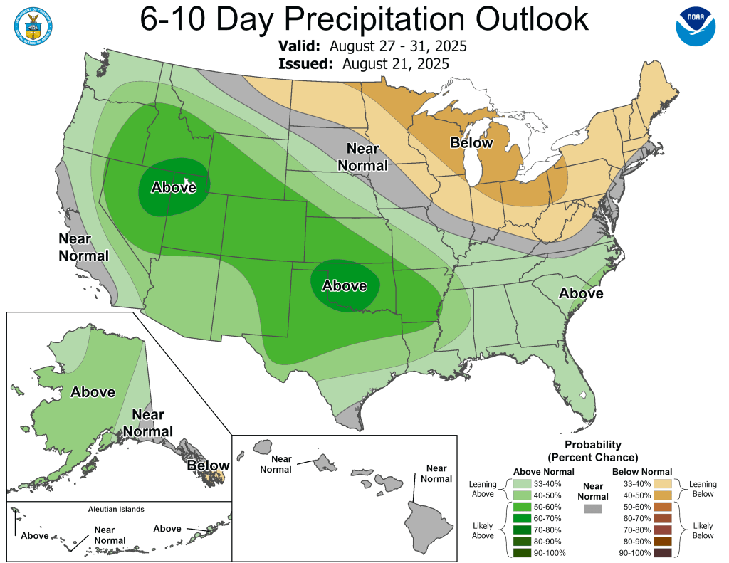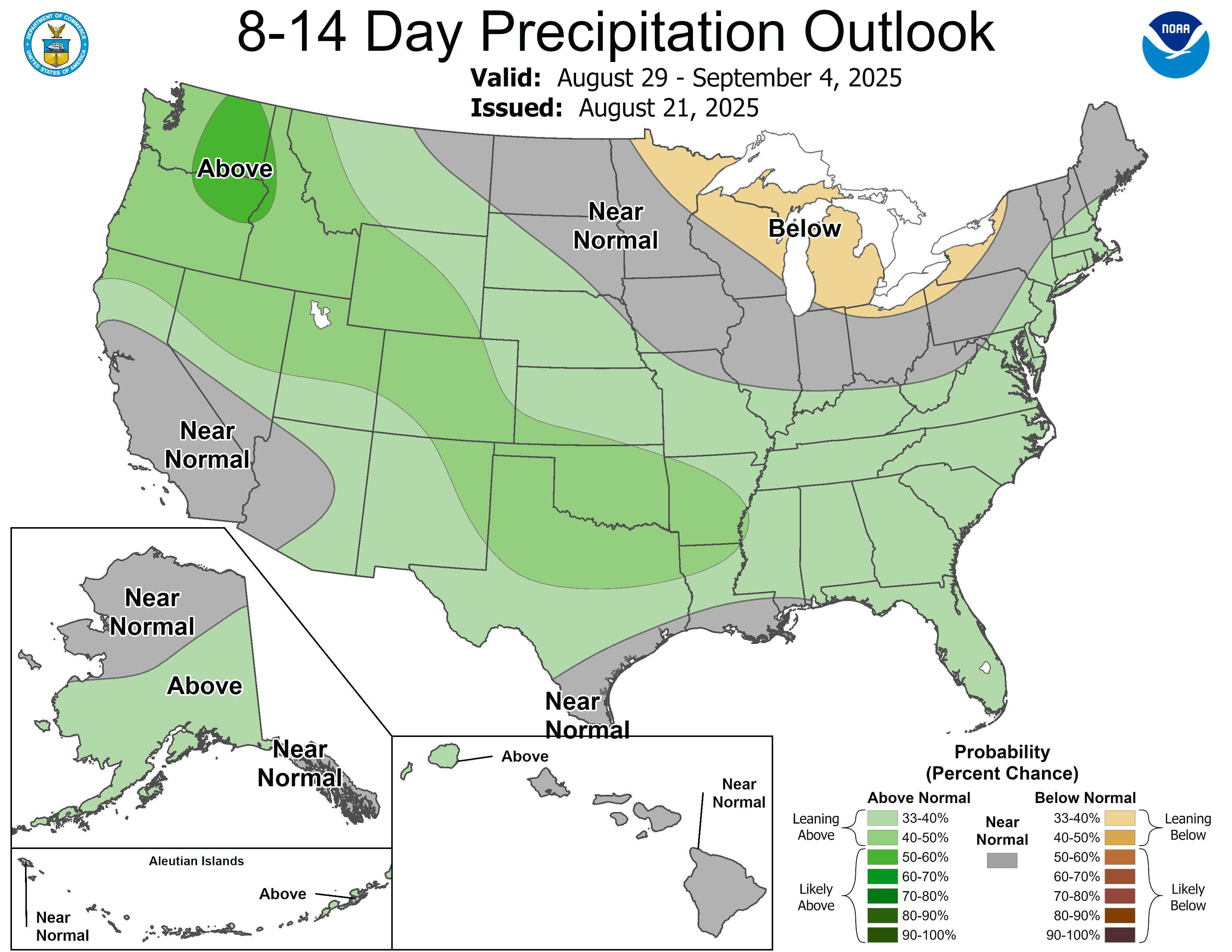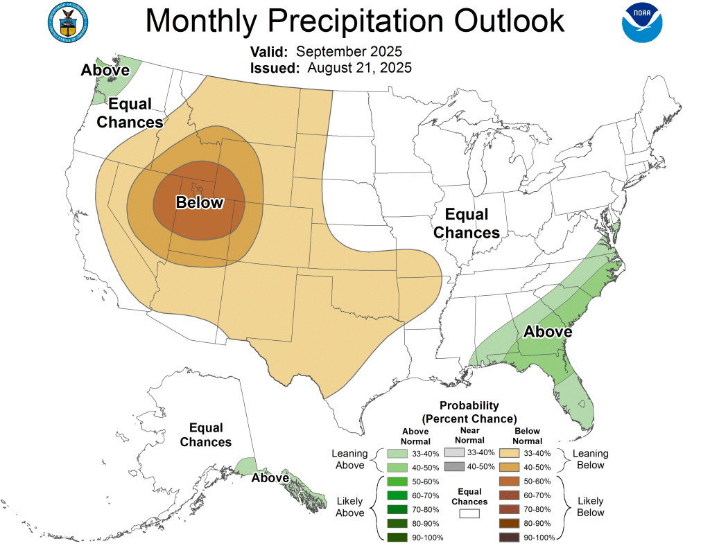 Early indications for just beyond this range suggest a return to above normal temperatures for the month of September with equal chances for above or below normal precipitation.