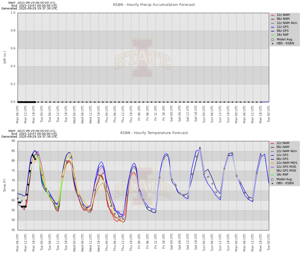 As you can see above, there is no precipitation forecasted over the next 10 days, and temperatures will be in the upper 70s and even low to mid-80s at times. The normal high temperature this time of year is 70 degrees with a low around 50. We’ll be 10 to 15 degrees above normal high temperatures and 5-10 degrees above normal low temperatures over the next week and beyond. The warm and dry air is expected to stick around through at least mid-October.