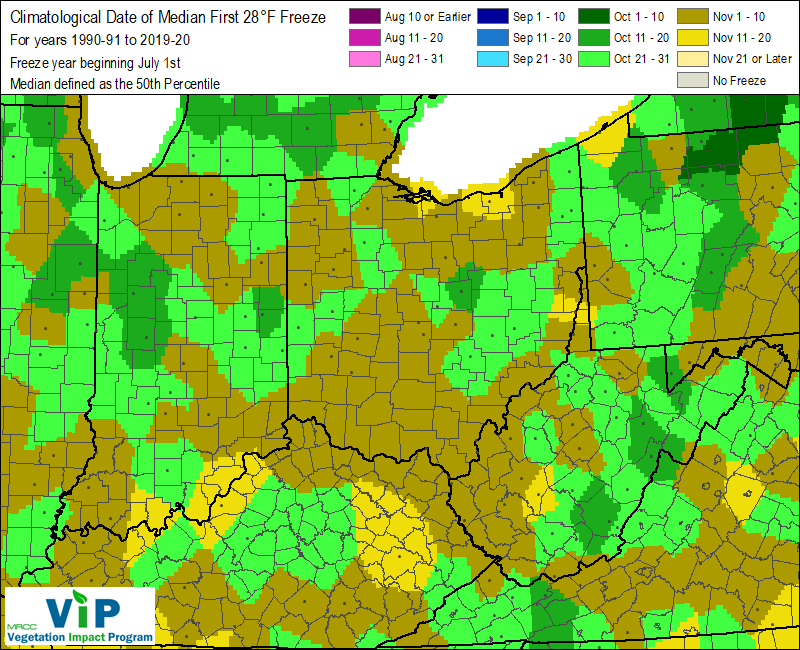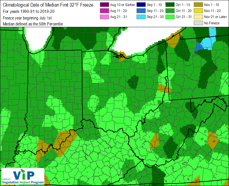 We are officially in frost/freeze season. We had two frost advisories this week, but I didn’t see any in my yard yet. Temps in my backyard just didn’t quite fall enough. Here’s a look at our climatological norms for when to expect our first freeze (32°F) and hard freeze (28°F).