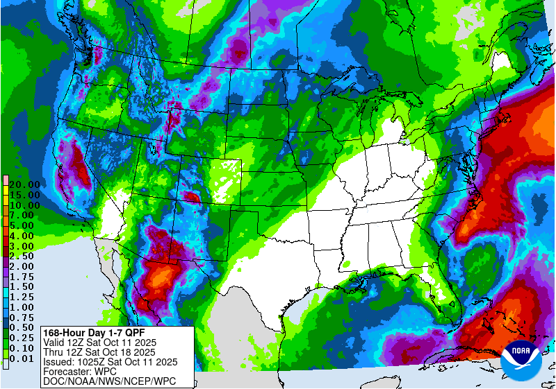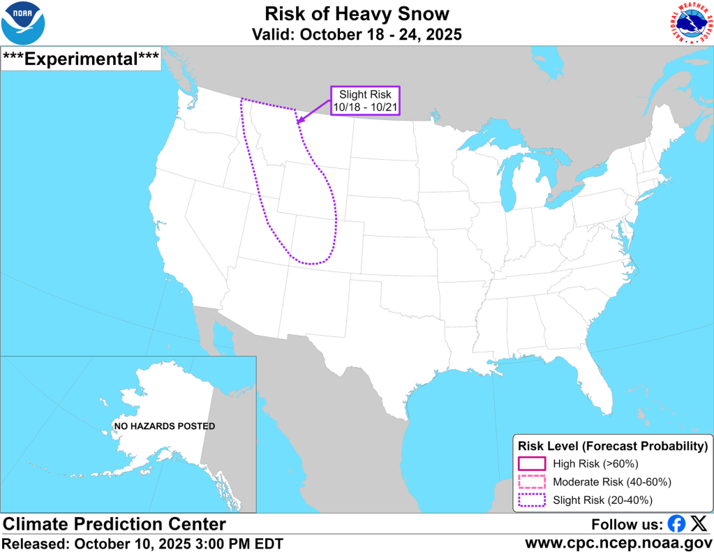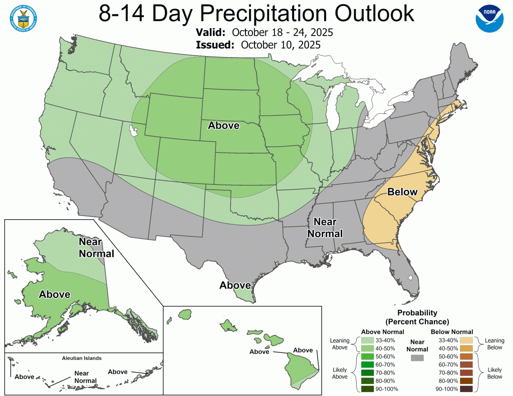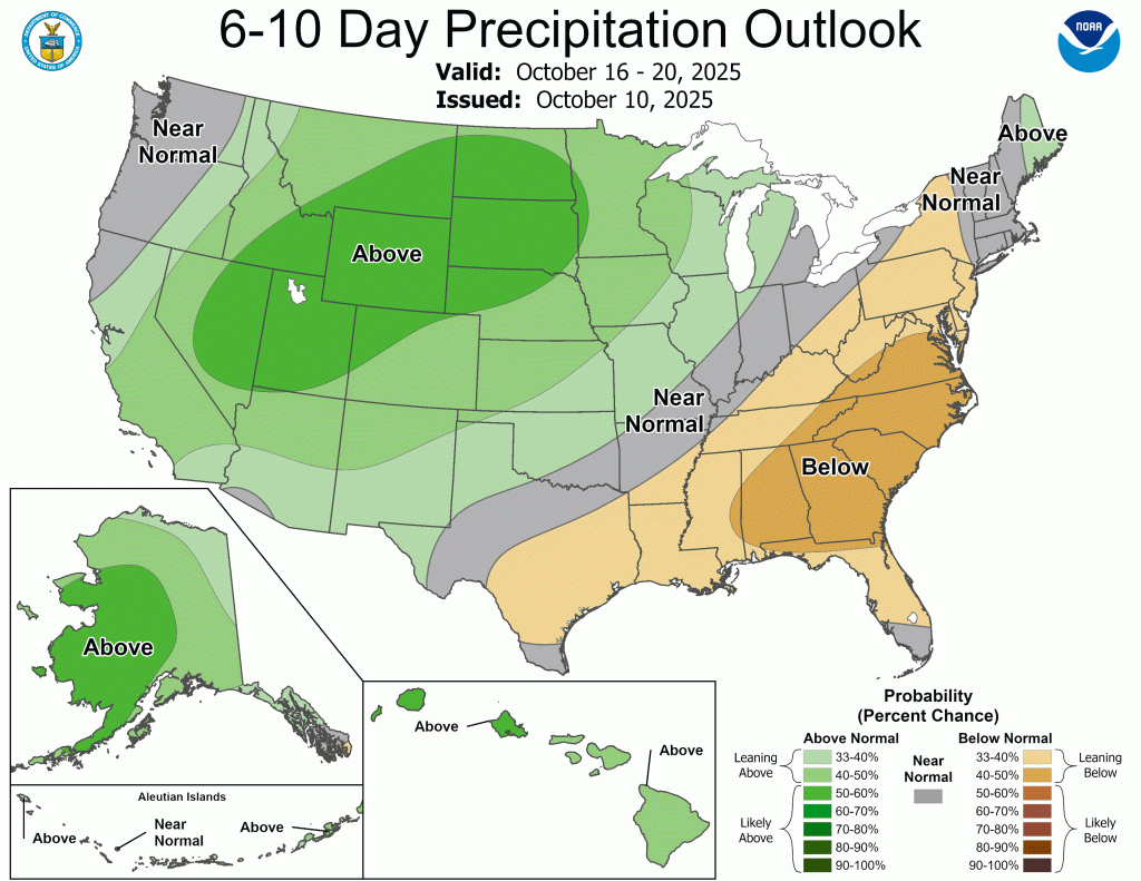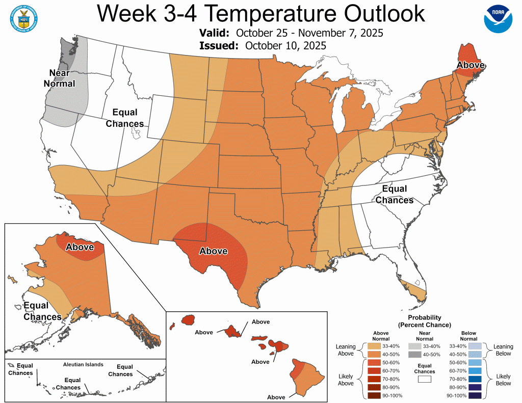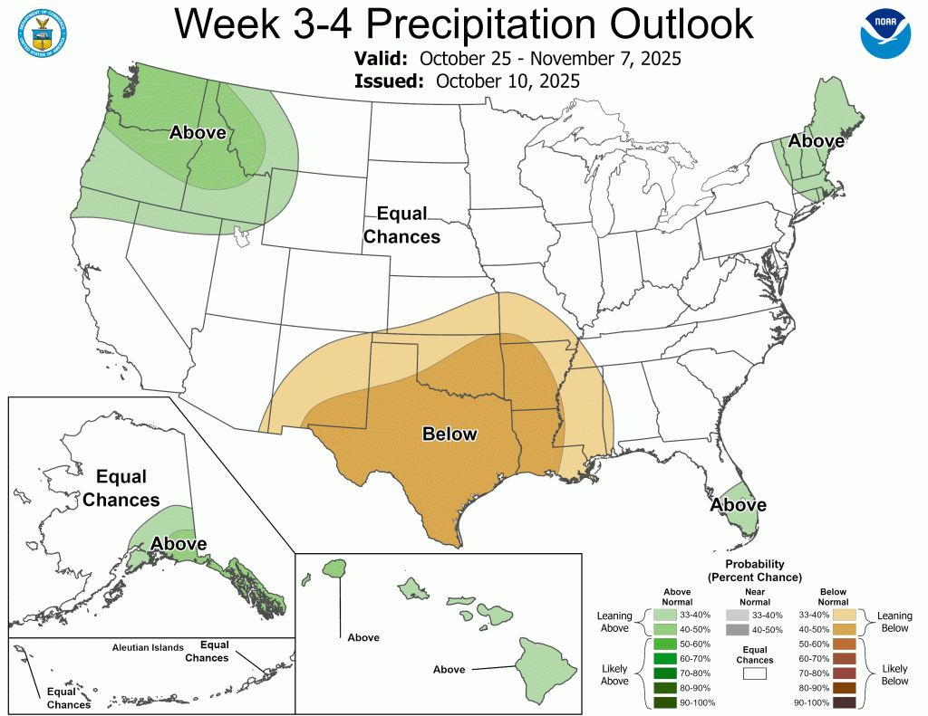 The good news is that our pattern, while warm, does look a bit more active as we head into the second half of October. And believe it or not, we ended September only 0.10” below normal. The problem was it only rained more than 0.25” in a day three times all month. Our drought situation continues to worsen, but there could be some relief as we close out October. There is not strong lean (equal chances for above or below normal precipitation) heading into November yet.