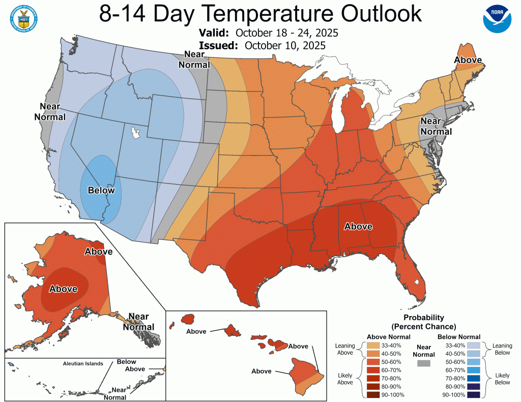 We get briefly warmer later this weekend and early next week with highs reaching the low to mid 70s, but we’ll settle back into the mid to upper 60s for highs by midweek and into next weekend. Our warmer-than-normal weather looks to continue through at least early November. Keep in mind that we’ll still be trending cooler—just not as cold as climatological norms.