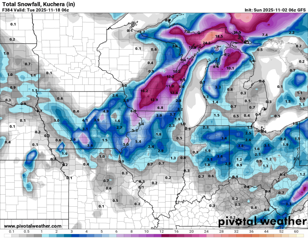 Now, to be 110% clear, I am not posting this because I think it will happen. I only show this to illustrate that some snow is starting to show up in the long range forecasts locally and that is a good indicator that it will be here soon enough. This is the latest run of the GFS model at its maximum range and it shows some snow in the area in mid-November. FYI – the Euro shows no snow anywhere at this range, nor does the previous run of the GFS. Again, it’s just fun to see snow showing up in these models already