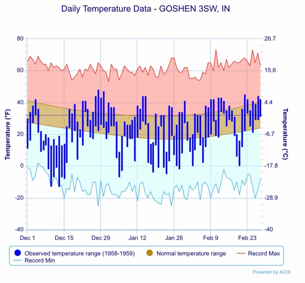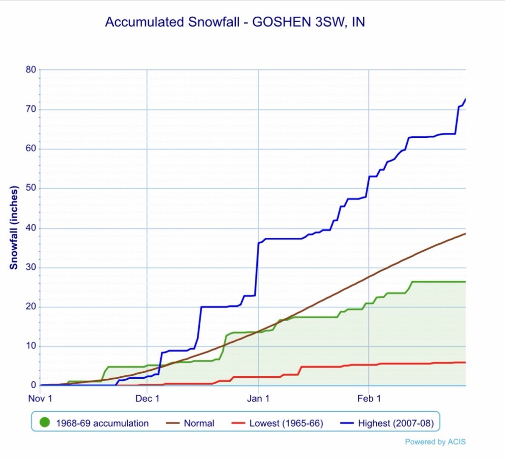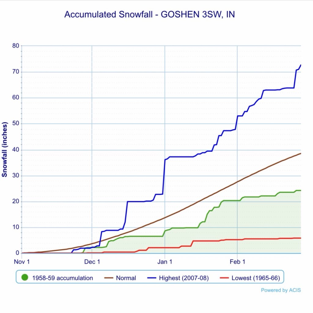 The data above all comes from the winter of 2000-2001, when the polar vortex weakened, but did not fully breakdown. The winters of 1958-1959 and 1968-1969 featured full breakdowns. Both years were abnormally cold, but both also featured well below normal snowfall. You can see their graphs below.