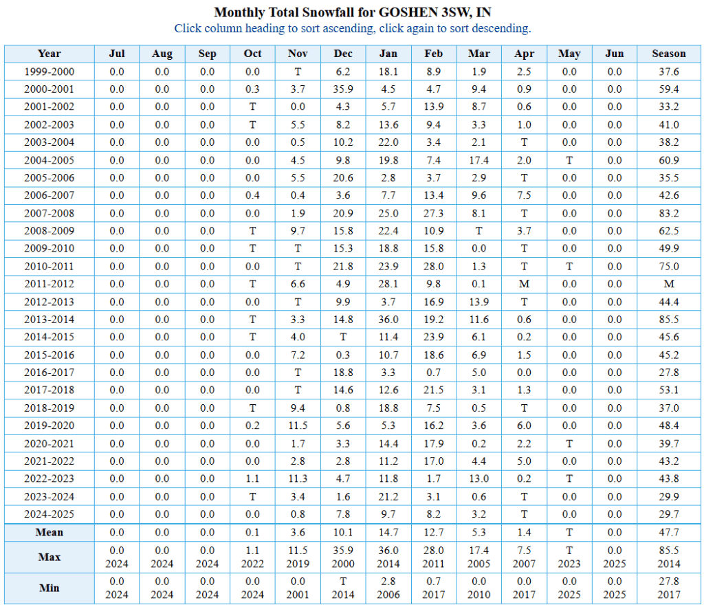 - Lake Michigan’s waters are in the 40s as of this writing, which will create opportunities for lake-effect snow. The early-season cold could result in earlier ice cover on the lake, shutting off the lake-effect snow machine and putting a damper on my winter snow forecast. However, I am hopeful that the favorable jet stream will send systems our way all winter. These systems almost always result in more snow for us in Goshen than most lake-effect snow events.