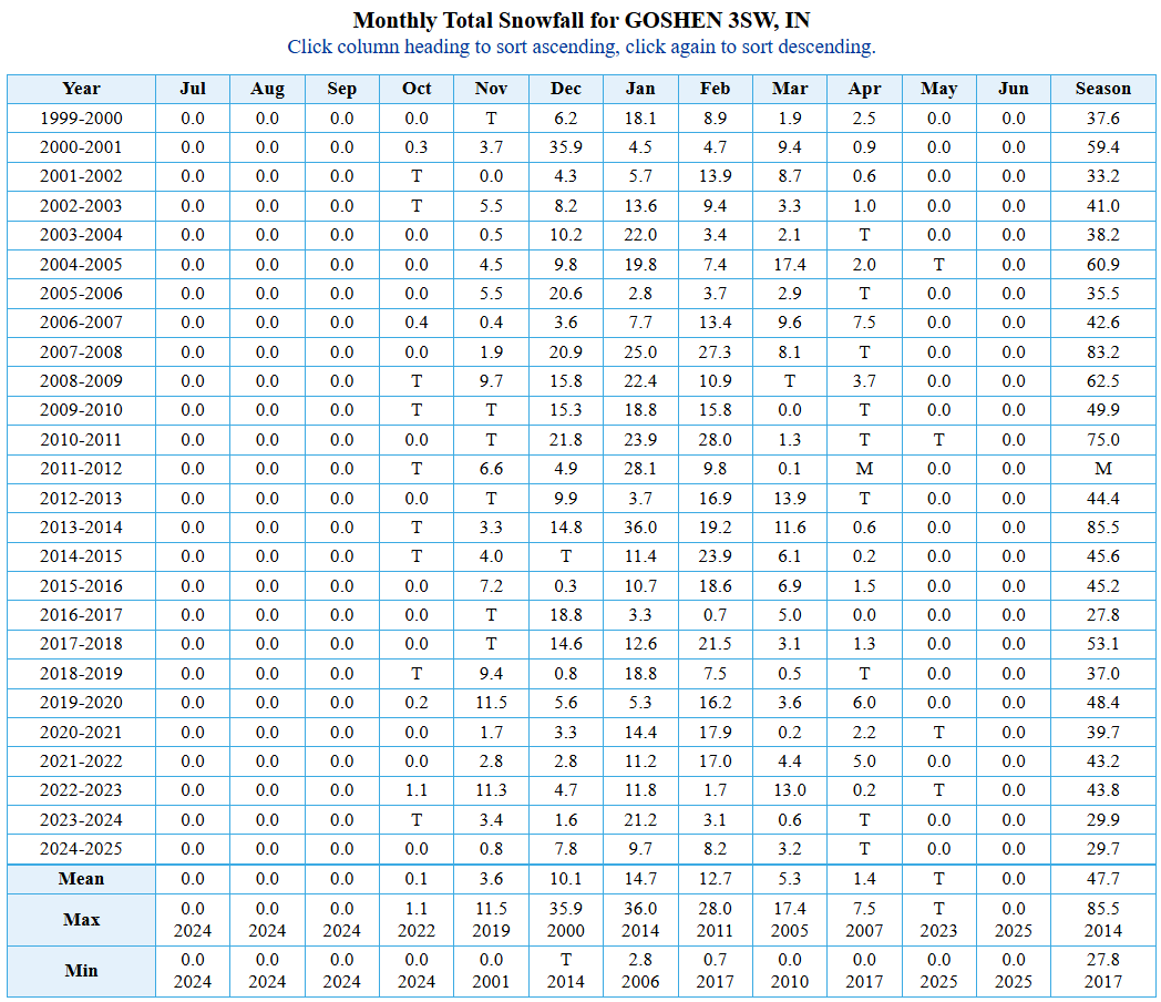 - Lake Michigan’s waters are in the 40s as of this writing, which will create opportunities for lake-effect snow. The early-season cold could result in earlier ice cover on the lake, shutting off the lake-effect snow machine and putting a damper on my winter snow forecast. However, I am hopeful that the favorable jet stream will send systems our way all winter. These systems almost always result in more snow for us in Goshen than most lake-effect snow events.