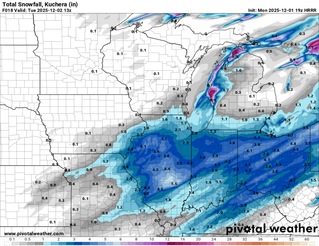 I think 1-3” is entirely appropriate at this point in time. The snow will get started relatively soon, roughly 6 PM, and can be seen approaching the IL/IN state line now.