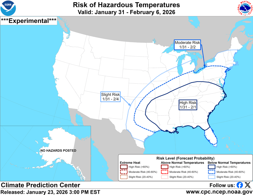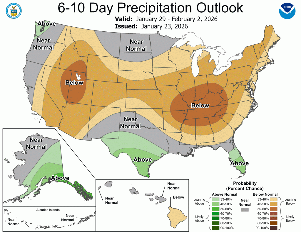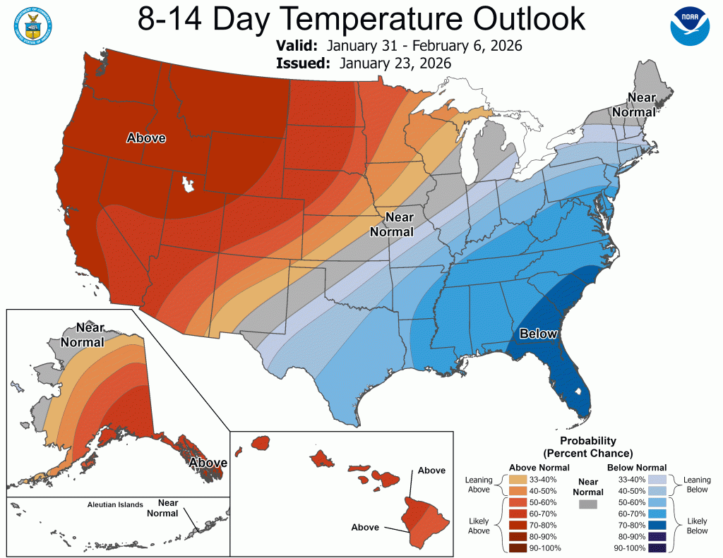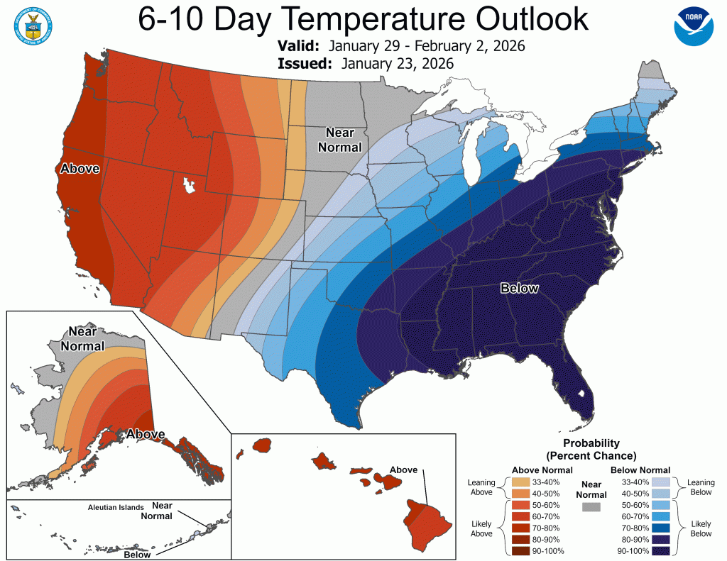 Beyond the next 6 days, the cold looks to hold on. Today’s CPC outlooks show a cold, but quieter end to January.